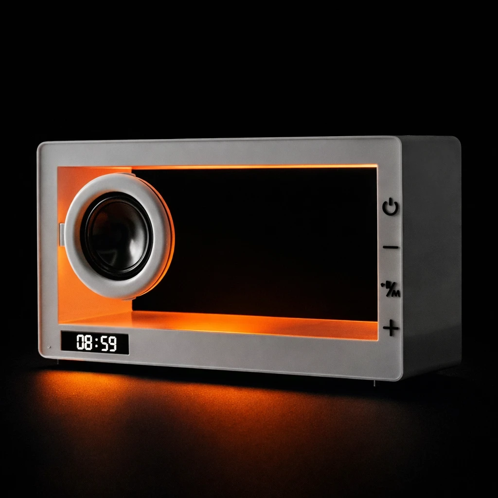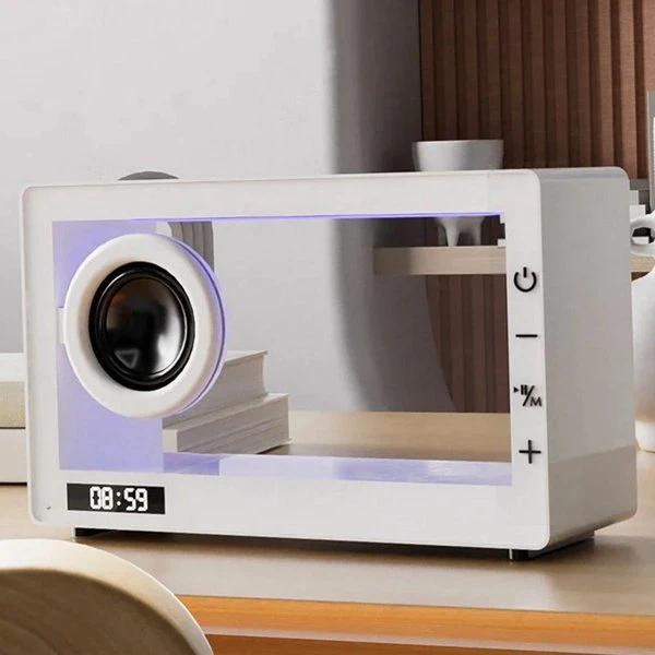 Parlante, reloj, despertador y espejo. Todo en un solo dispositivo.