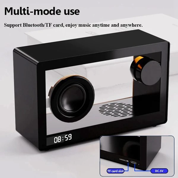 El compañero perfecto para la mesita de luz. Parlante Bluetooth 5.0 de 5W con subwoofer, reloj con pantalla LED espejo, doble alarma con snooze y Radio FM. Cuando la pantalla está apagada funciona como espejo real. Hasta 8hs de reproducción con batería recargable. Ideal para regalo.